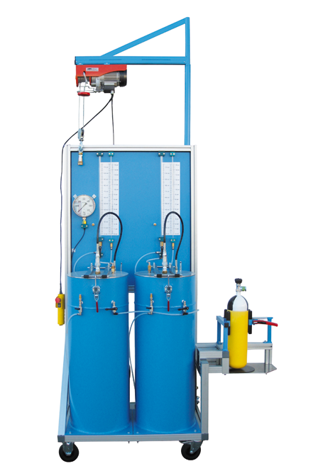 La máquina para la prueba volumétrica con dos depósitos, modelo HD-CFK-2, está diseñada para la prueba volumétrica hasta una presión de prueba de 450 bar de 2 botellas de hasta 18 l de volumen al mismo tiempo.