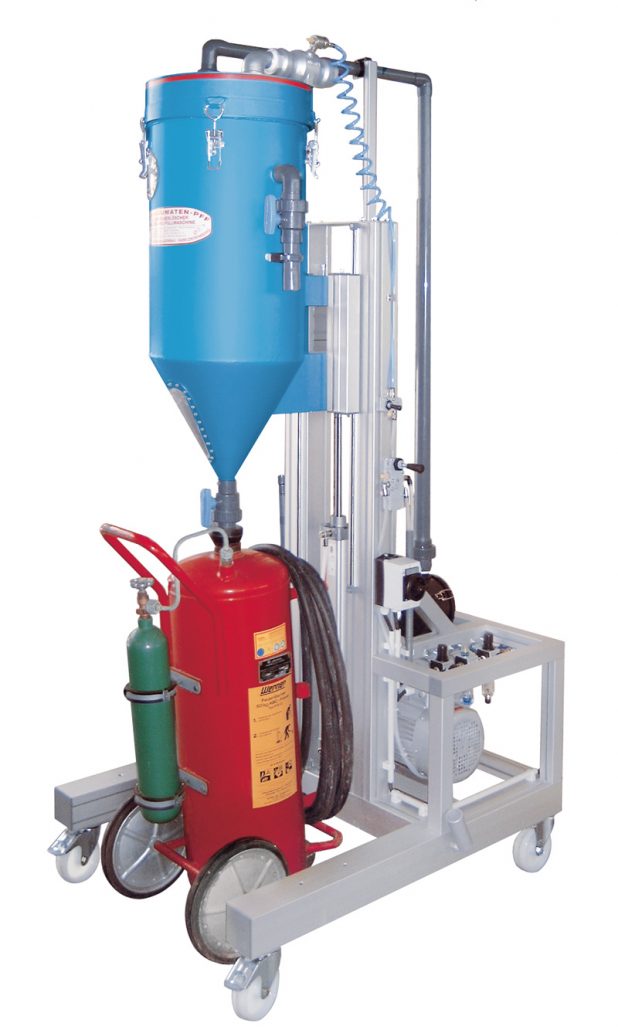 La máquina para la recarga de extintores, modelo PFF-SUMATIC-V 100/50, tolva de polvo fija y móvil para la recarga de extintores portátiles y carros hasta tanques cisterna de polvo extintor. La PFF-SUMATIC-V 100/50 es nuestra máquina móvil más potente e ideal para recargar tanques de polvo de hasta varias toneladas de capacidad.