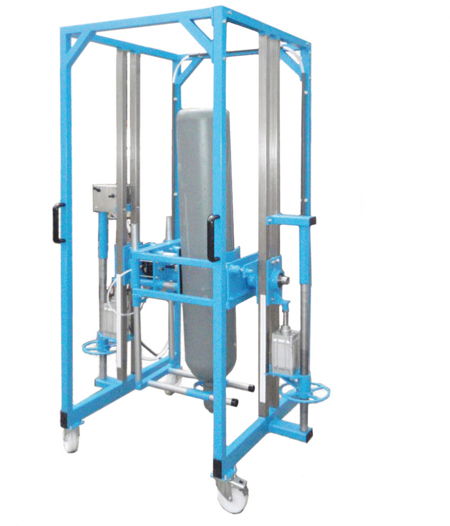 Una vez levantada se puede girar la botella a 360º y fijarla en 180º. La instalación está fabricada de acero y puede ser fijada en el suelo. La volteadora manual ayuda en el vaciado de la botella una vez terminada la prueba de presión.